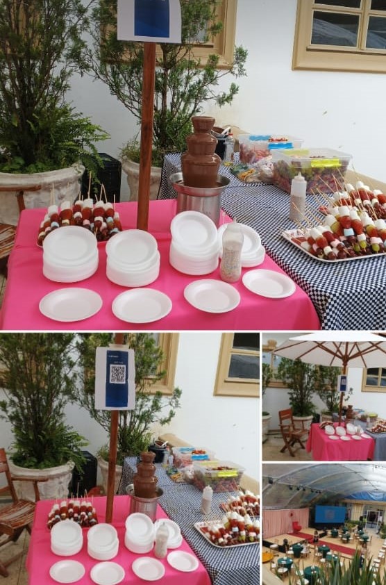 - fresa, masmelo, uva, Uchuvas, barquillos + pinchos + platos en icopor + servilletas + tarros de salsa y pepitas y decoración de mesa